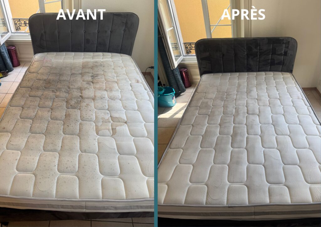 Celui-ci présentait plusieurs taches et une accumulation de saletés, nécessitant une intervention minutieuse. Grâce à notre service de nettoyage et d’hygiénisation, nous avons pu éliminer un maximum d’impuretés et redonner au matelas une propreté considérable, prolongeant ainsi sa durée d’utilisation.