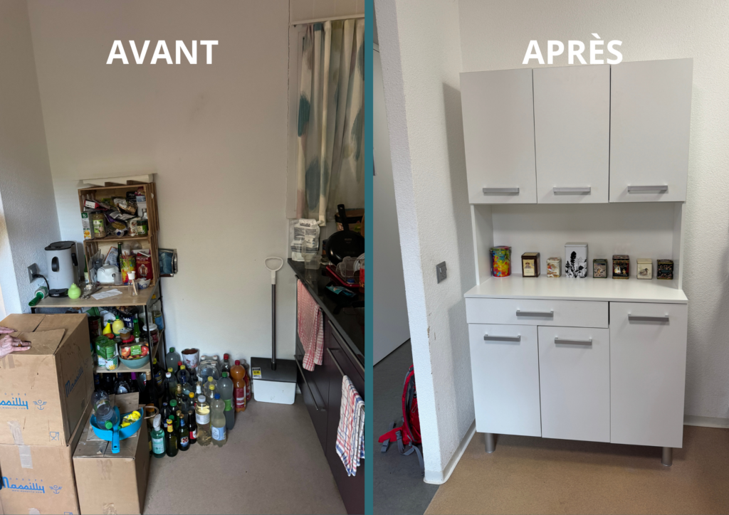 À la demande d’une cliente à Renens, nous avons transformé un coin encombré et peu fonctionnel en un espace de rangement clair et optimisé. La cuisine manquait de solutions pour organiser les provisions et ustensiles. Nous avons donc installé un meuble de rangement pratique et accessible, permettant de libérer le sol, d’optimiser la place et de faciliter l’accès aux différents éléments du quotidien.